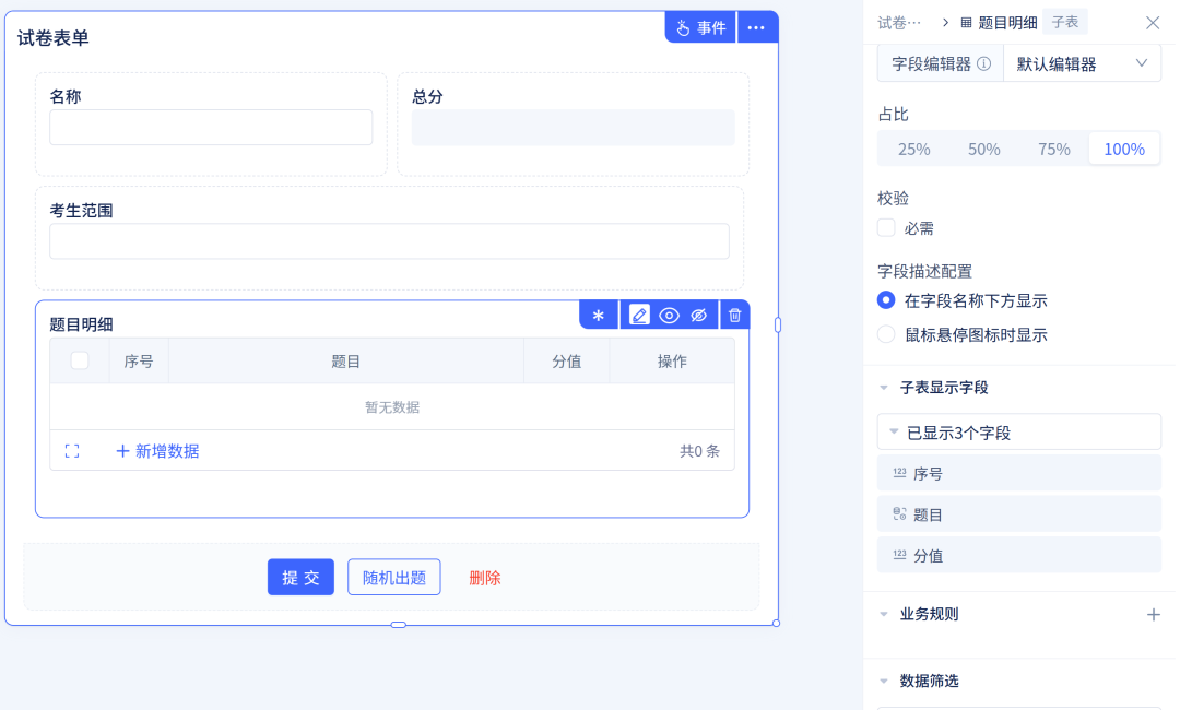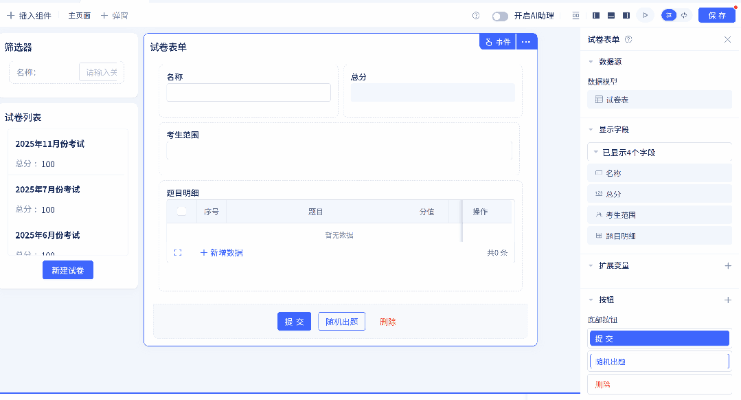 比如这个试卷管理的功能,我既可以在可视化界面下配置UI,又可以随时切换到代码模式去写代码,实现一些复杂的业务,两者实时同步,非常方便。