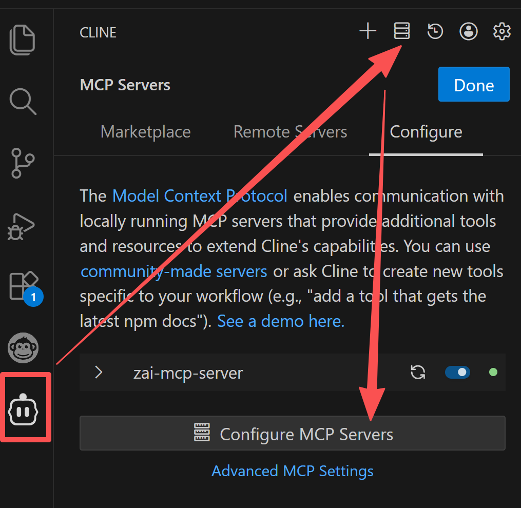 智谱的视觉MCP Server 支持Claude Code,Cline等多种AI Coding客户端,我用VS Code的插件Cline,配置起来也非常简单: