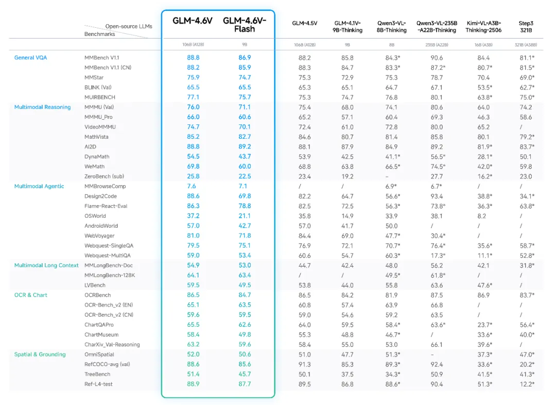 GLM-4.6V 在 MMBench、MathVista 等 30+ 评测中表现优异。106B 版本比肩 2 倍参数量的 Qwen3-VL-235B;9B 的 Flash 版本性能超过 Qwen3-VL-8B。