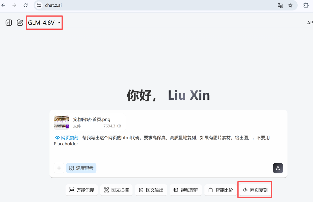 说干就干,立刻打开chat.z.ai ,选择GLM-4.6V 模型。