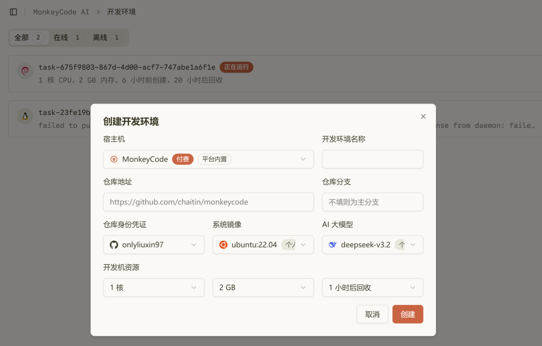 这个在线开发环境不仅仅是虚拟机,更是内置了AI Coding Agent(Claude Code、OpenAI Codex)和各种大模型(DeepSeek、Qwen、Kimi、GLM)。