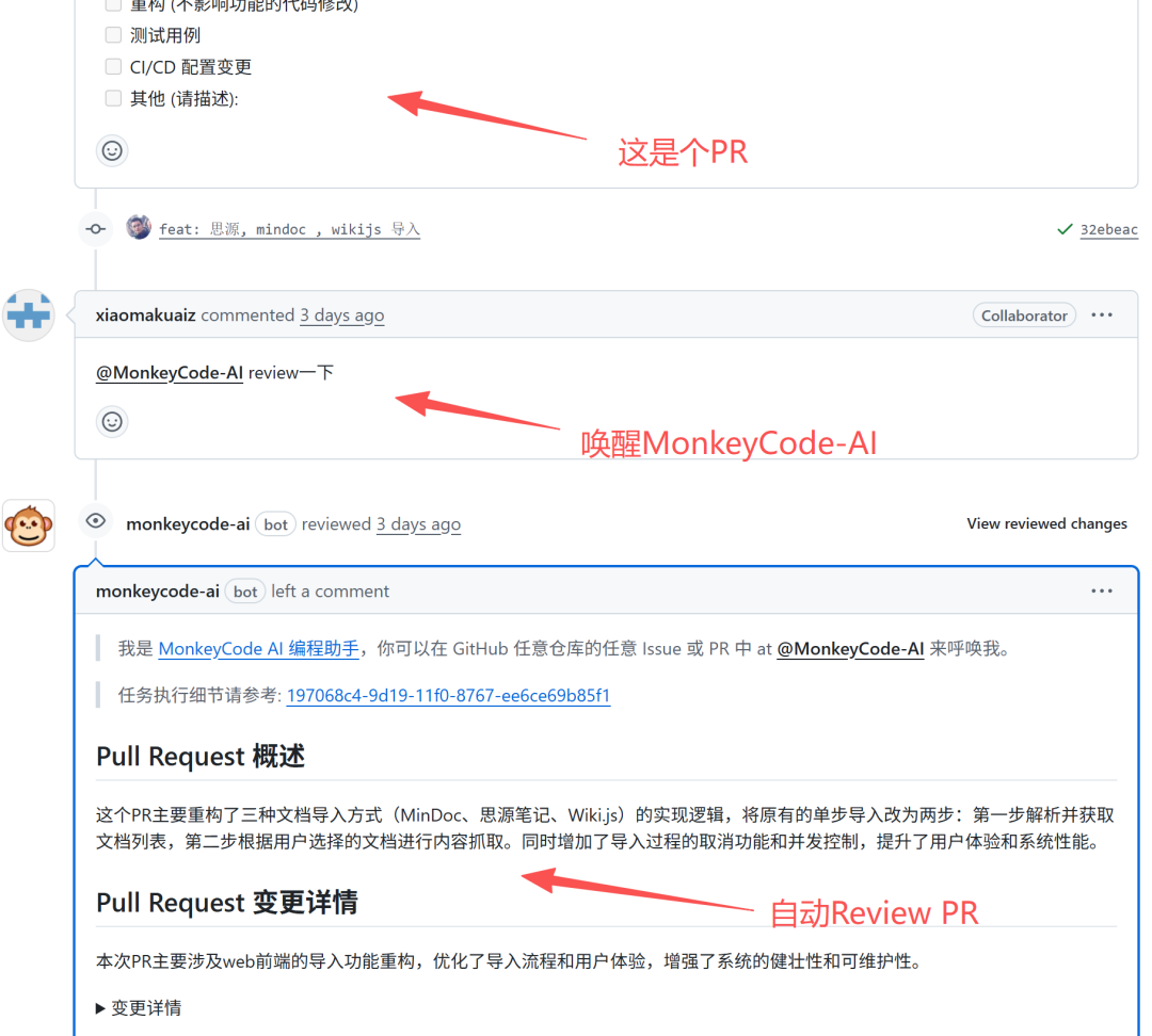 它的用法非常简单,只需要在PR或Issue 的评论区里 @monkeycode-ai,它就会立刻被召唤出来。