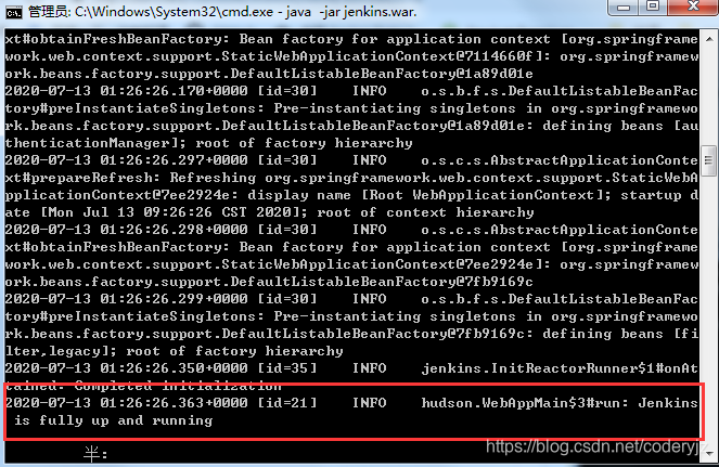 等到出现“jenkins is fully up and running”的信息,说明已经启动成功