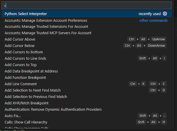 2、在VSCode IDE中,按ctrl+shift+p打开命令面板,输入Python:Select Interpreter。注意一定要出现">"才可以输入命令。