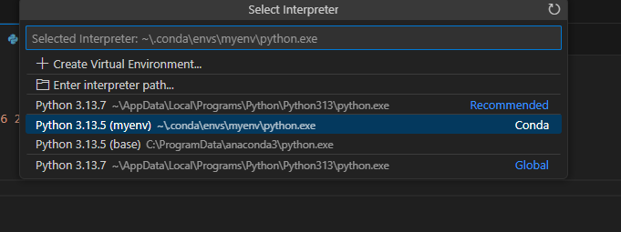 4、例如此处我们选择conda下的myenv就可以运行程序代码了。