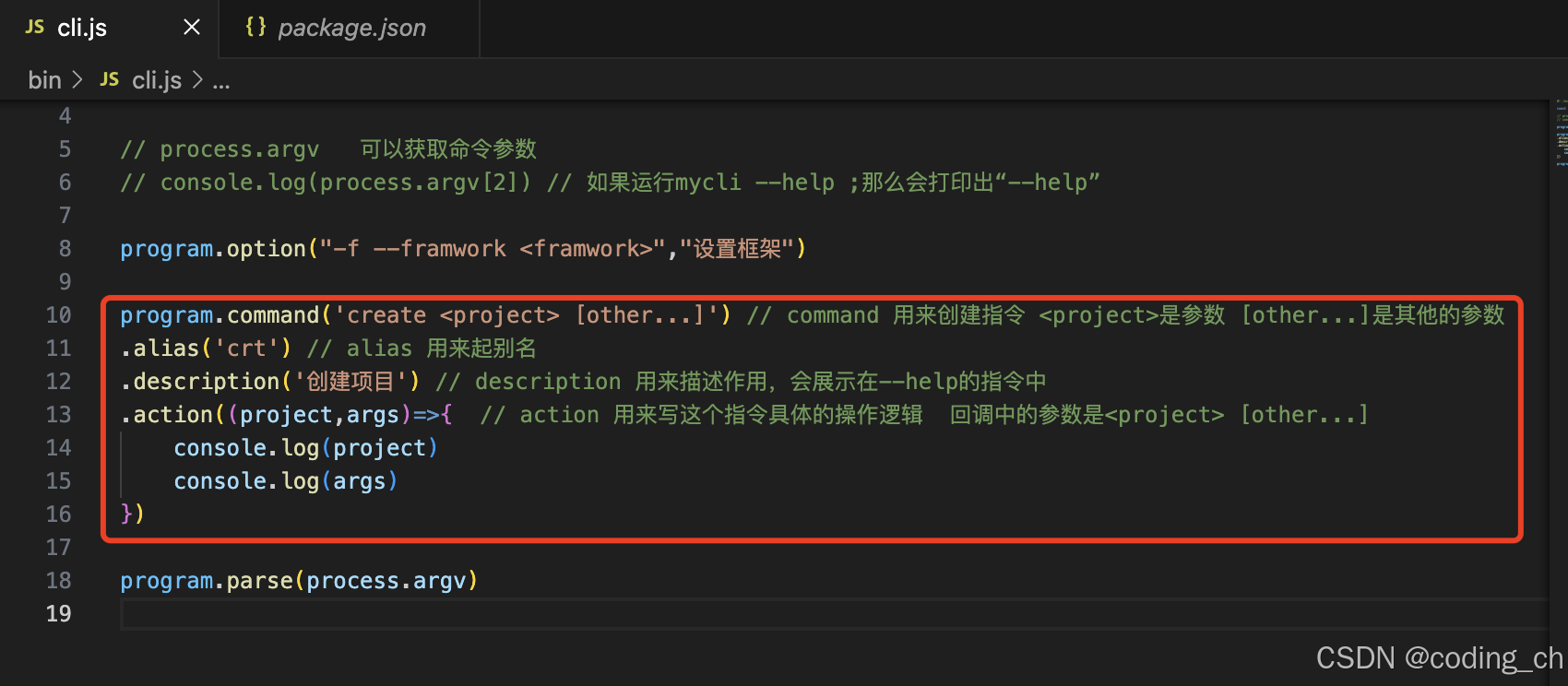 program.command('create <project> [other...]') // command 用来创建指令 <project>是参数 [other...]是其他的参数