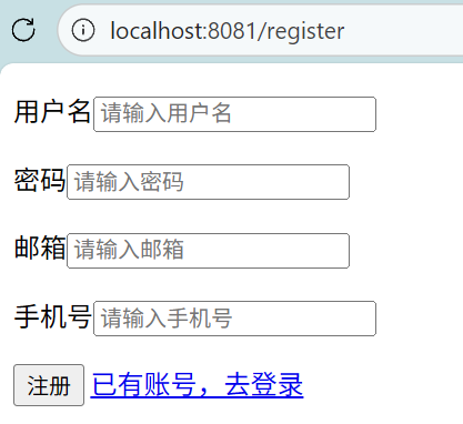 这里可以看见我有一个”已有账号,去登录“的一个跳转链接,我这里附上一下注册页面的代码: