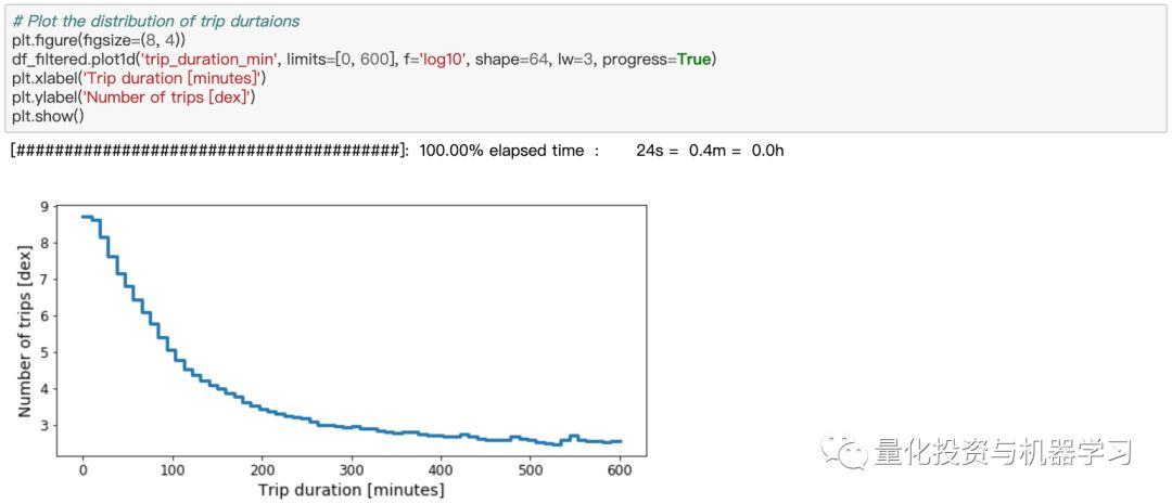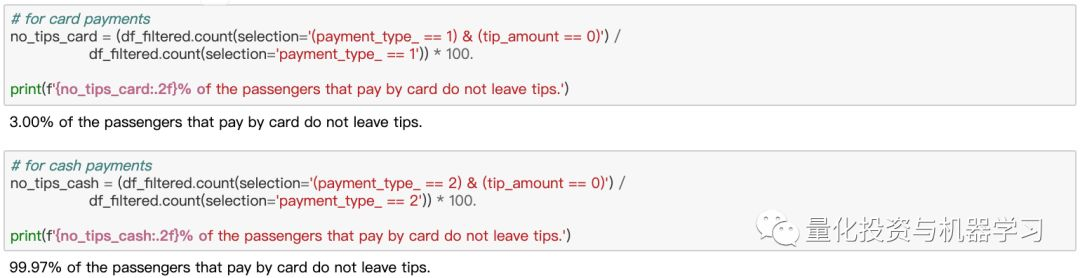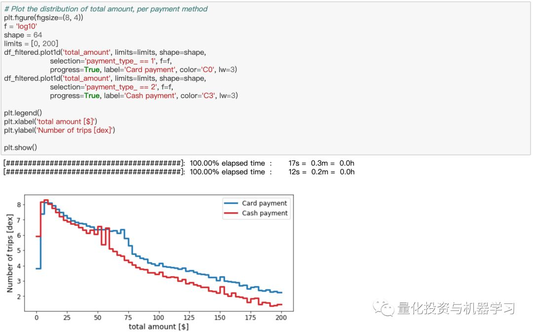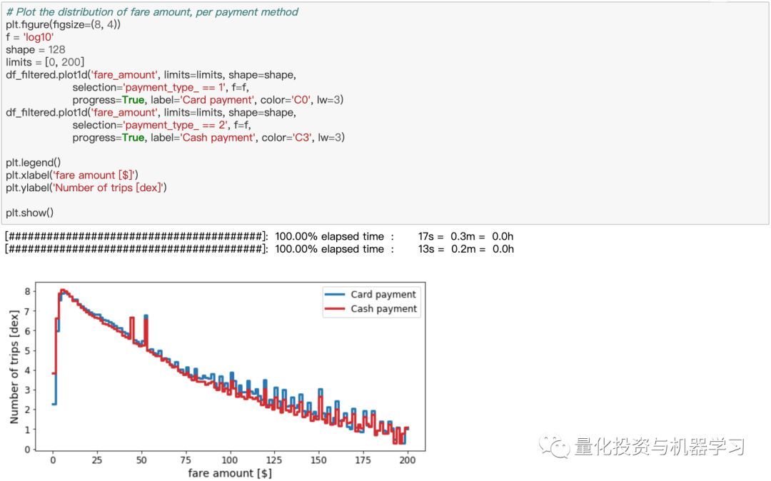 上面的代码块的优点在于:它所需要的内存可以忽略不计!在过滤Vaex DataFrame时,不会生成数据副本。相反,只创建对原始对象的引用,并在其上应用二进制掩码。掩码选择显示哪些行并用于将来的计算。这为我们节省了100GB的RAM,如果要复制数据,就需要这样做,就像现在许多标准的数据分析所做的那样。