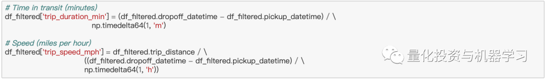 出行距离列中存在的极端离群值是调查出租车出行时间和平均速度的原因。这些特征在数据集中是不容易获得的,但是计算起来很简单: