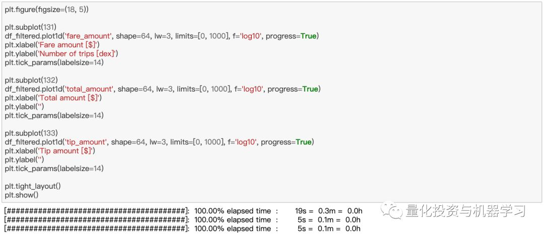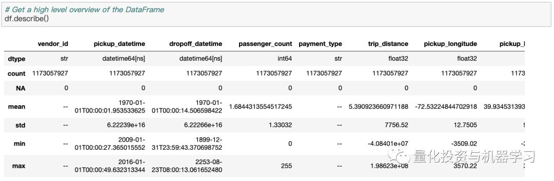 describe方法很好地说明了Vaex的性能和效率:所有这些统计数据都是在MacBook Pro(15英寸,2018年,2.6GHz Intel Core i7,32GB RAM)上用不到3分钟计算出来的。其他库或方法需要分布式计算或超过100GB的云才能预先相同的计算。有了Vaex,你所需要的只是数据,以及只有几GB内存的笔记本电脑。
