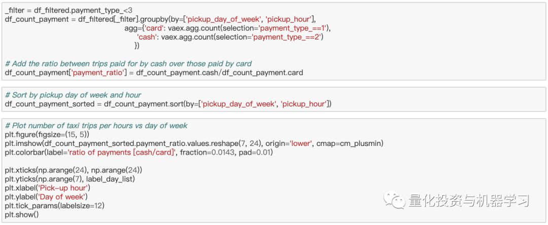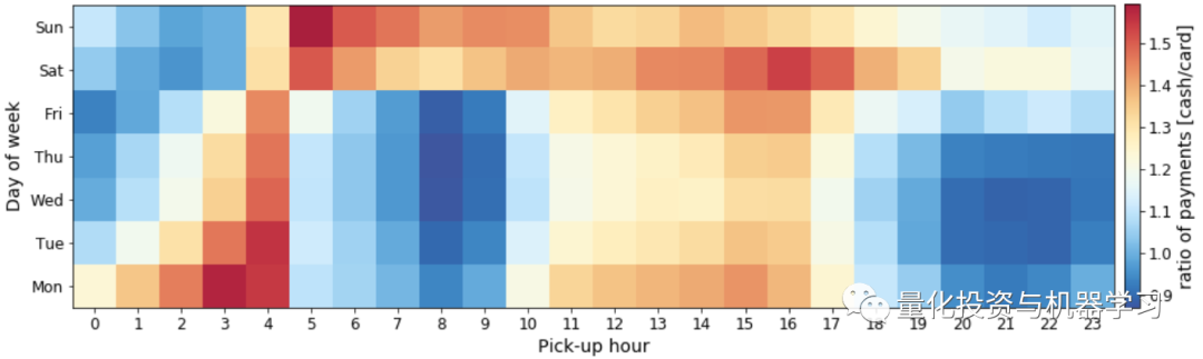 最后,让我们通过绘制现金支付与信用卡支付之间的比率来查看付款方法是否取决于当天的时间或星期几。为此,我们将首先创建一个过滤器,它只选择用现金或信用卡支付。下一步是具有Vaex特色功能的操作:带有选择的聚合。其他库要求对每个支付方法进行聚合,然后将这些支付方法后来合并为一个支付方法。 另一方面,我们可以通过在聚合函数中提供的参数,一步完成这个操作。 这非常方便,只需要传递一次数据,就可以获得更好的性能。 然后,我们可以用标准的方式绘制出最终的DataFrame: