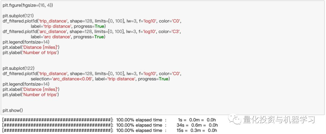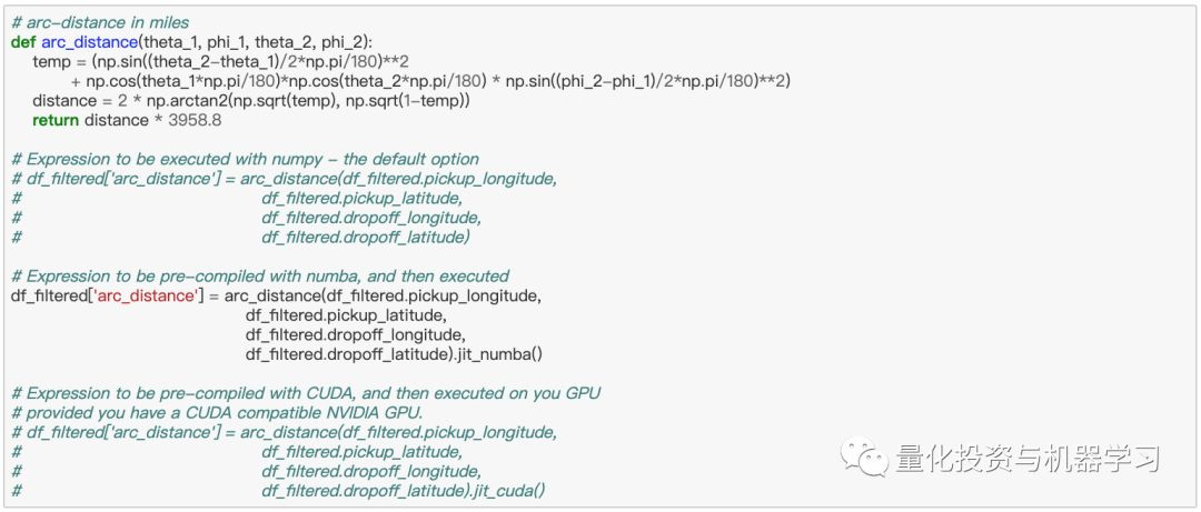 arc_distance的计算公式非常复杂,它包含了大量的三角函数和算术知识,特别是在处理大数据集的情况下,计算量很大。如果表达式或函数仅使用来自Numpy包的Python操作和方法编写,Vaex将使用计算机的所有核心并行地计算它。除此之外,Vaex通过Numba(使用LLVM)或Pythran(通过C++加速)支持即时编译,从而提供更好的性能。如果你有NVIDIA显卡,你可以通过jit_cuda方法使用CUDA来获得更快的性能。