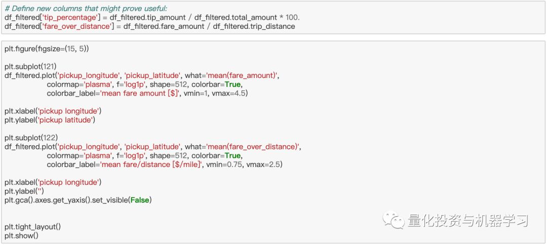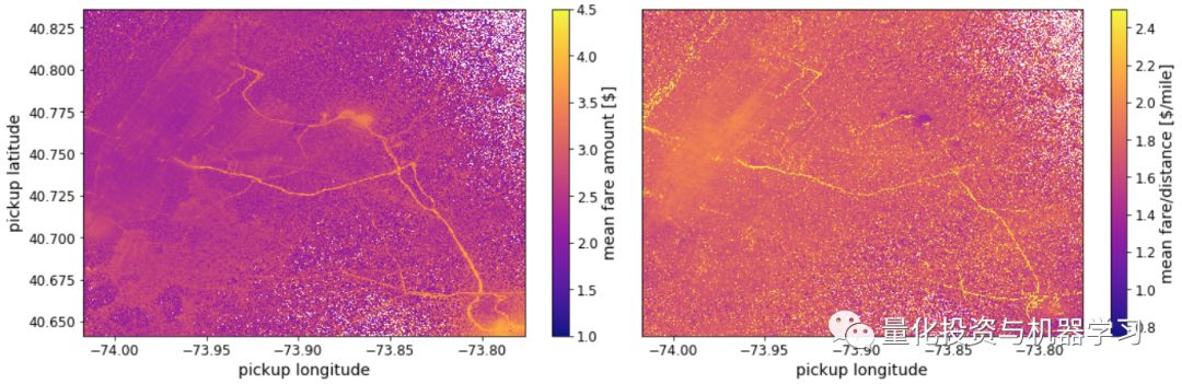 让我们从找出从平均值而言,能带来较好收入的载客地点开始。我们只需绘制一张热点地区接送地点的热图,对平均票价进行颜色编码,然后查看热点地区。然而,出租车司机也有自己的成本。例如,燃料费用。因此,把乘客带到很远的地方可能会导致更高的票价,但这也意味着更大的燃料消耗和时间损失。此外,从偏远的地方载一个乘客去市中心可能不那么容易,因此在没有乘客的情况下开车回去可能会很贵。一种解释的方法是,用票价金额与出行距离之比的平均值来表示热图的颜色。让我们考虑一下这两种方法: