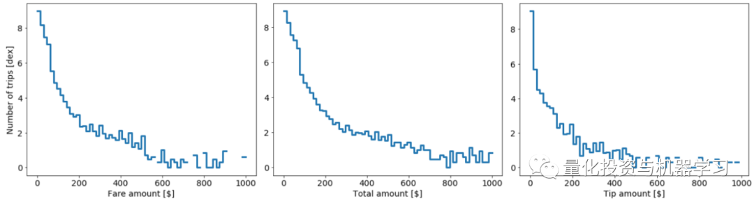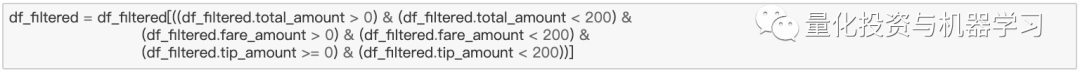 我们看到上面的三个分布都有相当长的尾部。尾部的一些值可能是正确的,而其他值可能是错误的数据输入。无论如何,让我们现在保守一点,只考虑票价为fare_amount、total_amount和tip_amount低于200美元的乘客。我们还要求fare_amount、total_amount的值大于0。