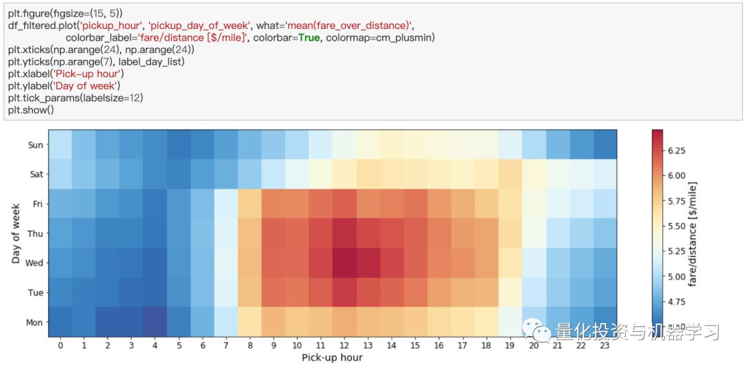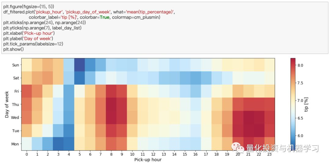 上面的结论很有趣。它告诉我们,乘客在早上7点到10点之间给出租车司机的小费最多,如果你在凌晨3点或4点接乘客,不要指望会有大额小费。