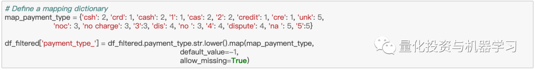 因此,我们可以简单地将payment_type列中的条目映射到整数: