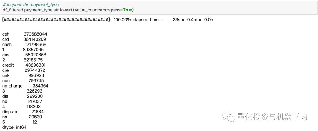 让我们再调查一下乘客是如何支付他们的车费的:payment_type列,让我们看看它包含的值: