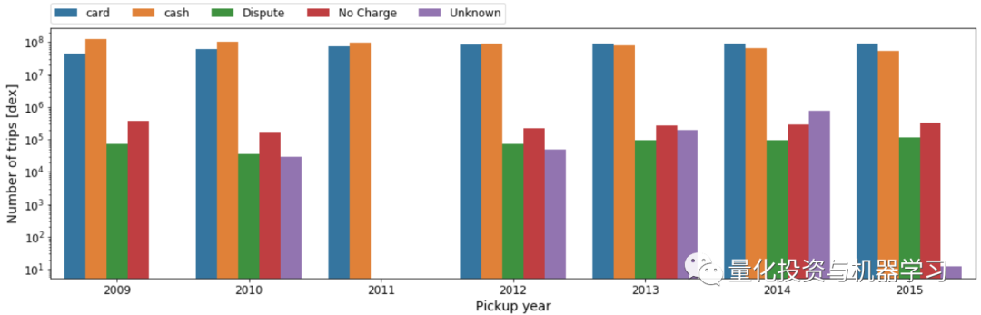 现在我们可以根据每年的数据进行分组,看看纽约人在支付打车费用方面的习惯是如何改变的: