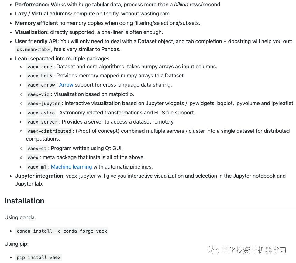 Vaex是一个开源的DataFrame库,它可以对表格数据集进行可视化、探索、分析,甚至机器学习,这些数据集和你的硬盘驱动器一样大。它可以在一个n维网格上每秒计算超过10亿(10^9)个对象的平均值、和、计数、标准差等统计信息。可视化使用直方图、使用直方图、密度图和3D立体渲染进行可视化。为此,Vaex采用了内存映射、高效的外核算法和延迟计算等概念来获得最佳性能(不浪费内存)。所有这些都封装在一个类似Pandas的API中。