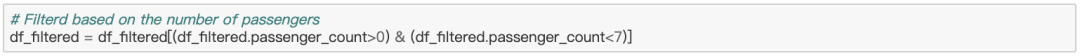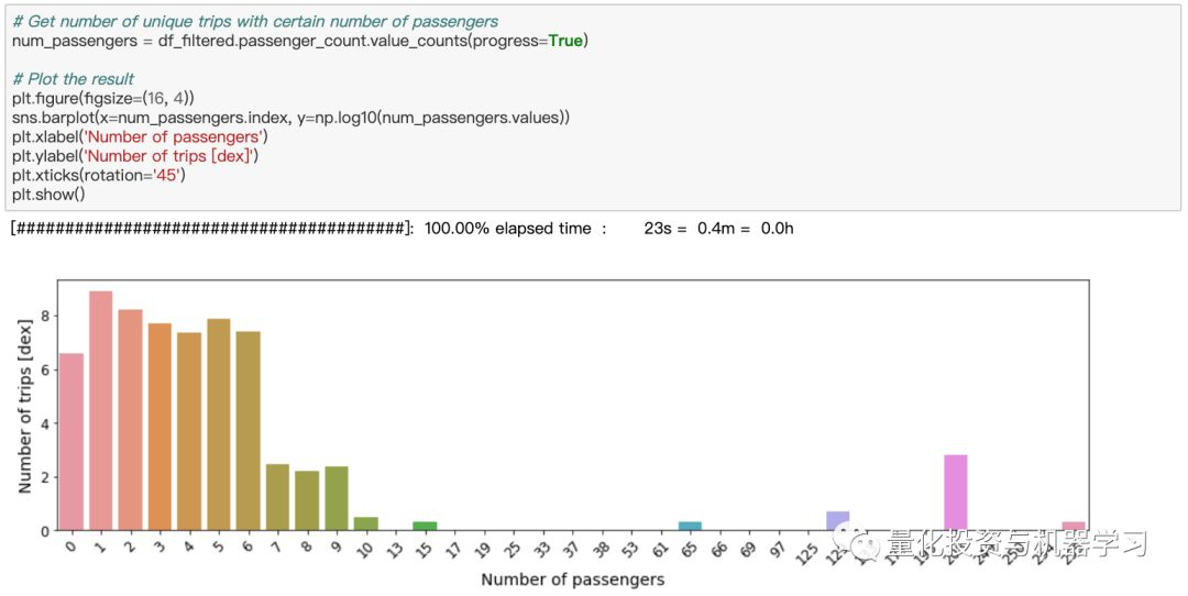从上图中我们可以看出,乘客超过6人的出行很可能是罕见的异常值,或者是数据输入错误。也有大量的出现,没有(0名)乘客。既然现在我们还不知道这些旅行是否合法,那就让我们把它们过滤掉吧。
