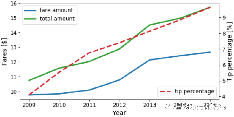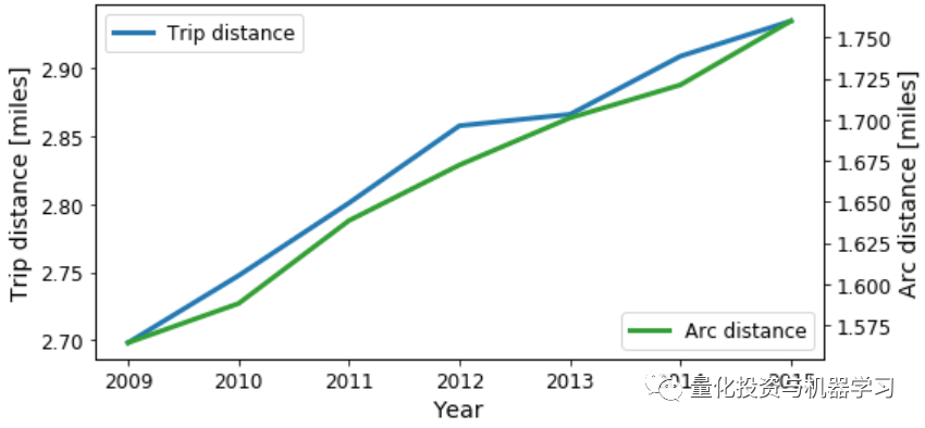 上图显示,trip_distance和arc_distance都有一个小的增长,这意味着,平均而言,人们倾向于每年走得更远一点。