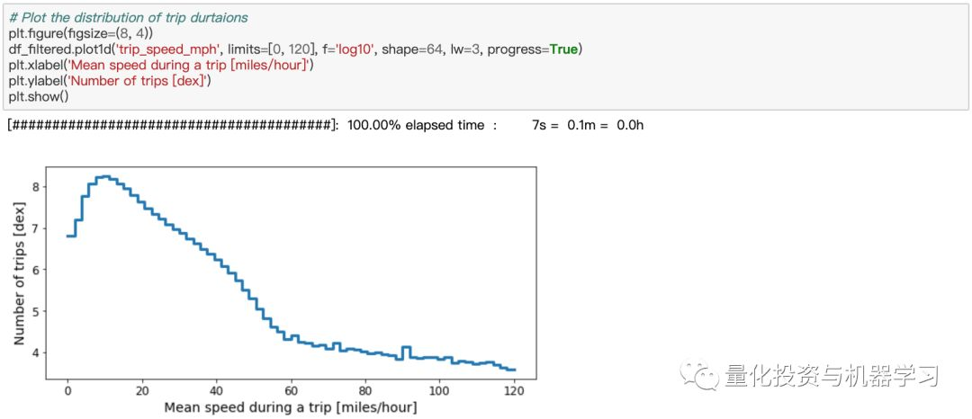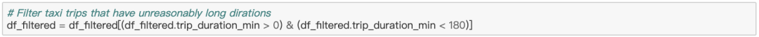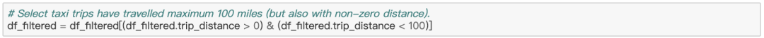 根据分布趋平的地方,我们可以推断出合理的出租车平均速度在每小时1到60英里之间,因此我们可以更新过滤后的dataframe: