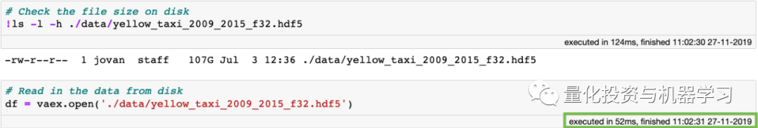 第一步将数据转换为内存映射文件格式,如Apache Arrow、Apache Parque 或HDF5。一旦数据成为内存映射格式,使用Vaex打开它是瞬间的(数据的磁盘大小超过100GB)。有多块?