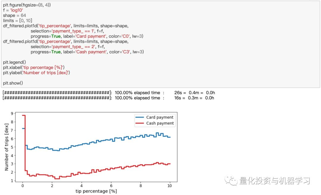 从上面的图可以看出,显示的小费百分比可以作为一周的某天或一天的某时段的函数。从这两个图中表明,用信用卡支付的乘客比用现金支付的乘客更倾向于给小费。看看分布: