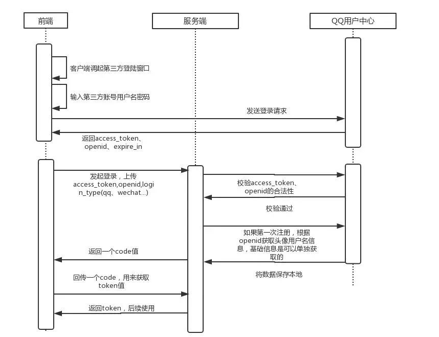 客户端拿到access_token、openid、login_type(qq、wechat…)请求应用服务器,应用服务器拿到这些数据后就会根据对应的login_type去对应的用户中心进行access_token和openid进行校验。