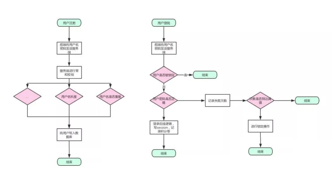 前端将用户名、密码发送到服务器,服务器进行常规的判断,判断用户名、密码长度是否满足,用户名是否重复等条件,条件不通过直接返回对应错误码给到前端,这里密码字段,为了防止传输过程中被截胡,建议加密再上传,我们的传输密码默认都是会进行一个md5加密,然后记录到数据库再进行一层加密,就算是脱库也没事,密码不要明文存储。