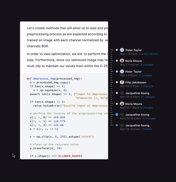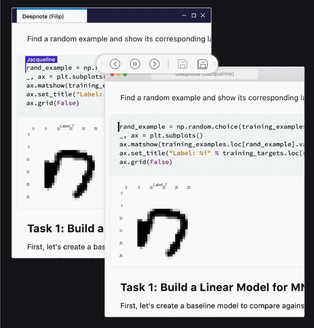 DeepNote 支持在共享计算环境中无缝合作,也就是说当我们在做一个项目时,团队伙伴如果有了好的想法,可以更加快速的分享,而且是实时同步地看到代码运行状态。