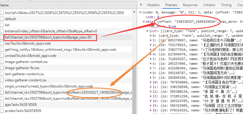 其中要提到一点,url中的offest从解析上一个url的json中获取,如如下图所示。