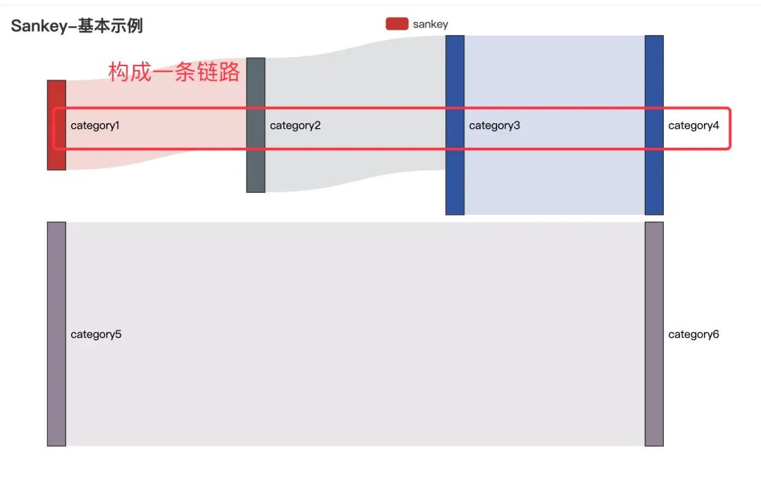 在上面的代码中,nodes部分表示的是所有的节点名称,不管是父节点还是最小的子节点都要列出来;links部分表示的是每条链路的数据,包含:父节点source + 子节点target + 数据值value。根据links的数据,我们可以发现:category1——-category2———category3———category4构成了一条完整的链路,category5—category6构成了另一条链路。