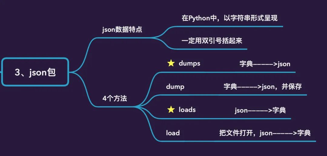 dumps:python字典数据类型转成json数据类型的字符串dump:字典数据转成字符串并且存储在文件中loads:把json字符串转成字典数据类型load:把文件打开,并且从字符串转换成字典数据类型