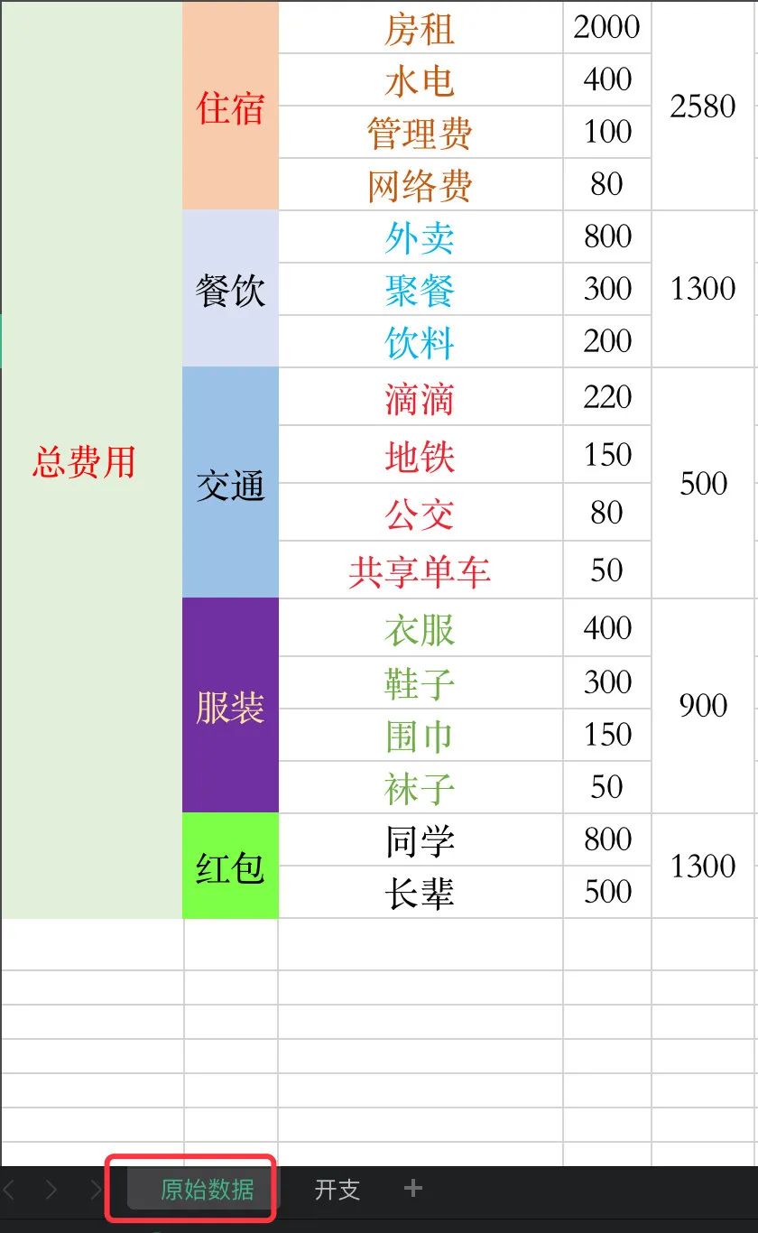 3、我们将上面两个步骤得到的数据放入一个sheet中,命名为开支: