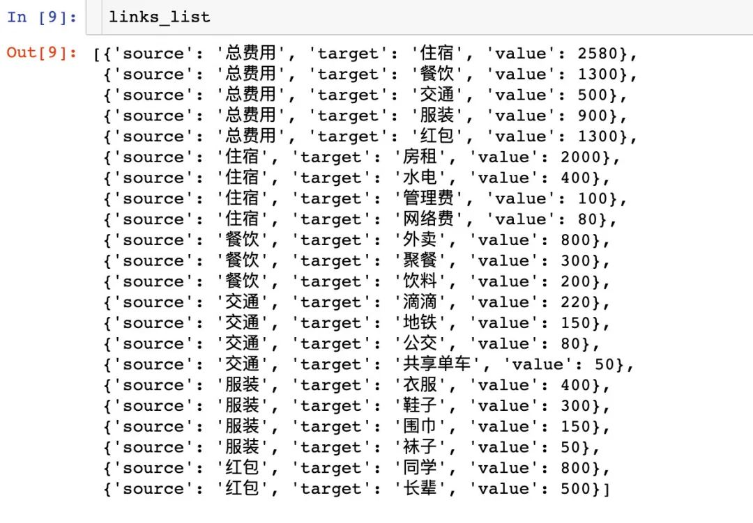'links': [{'source': '总费用', 'target': '住宿', 'value': 2580}, # 链路部分数据