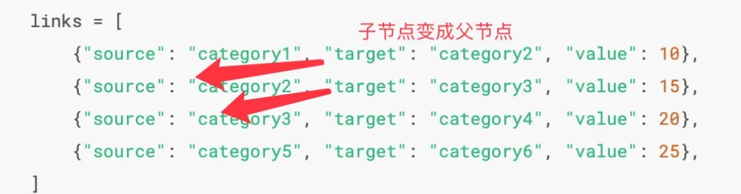 links = [ # 每一条链路的数据,包含:父节点source + 子节点target + 数据值value
