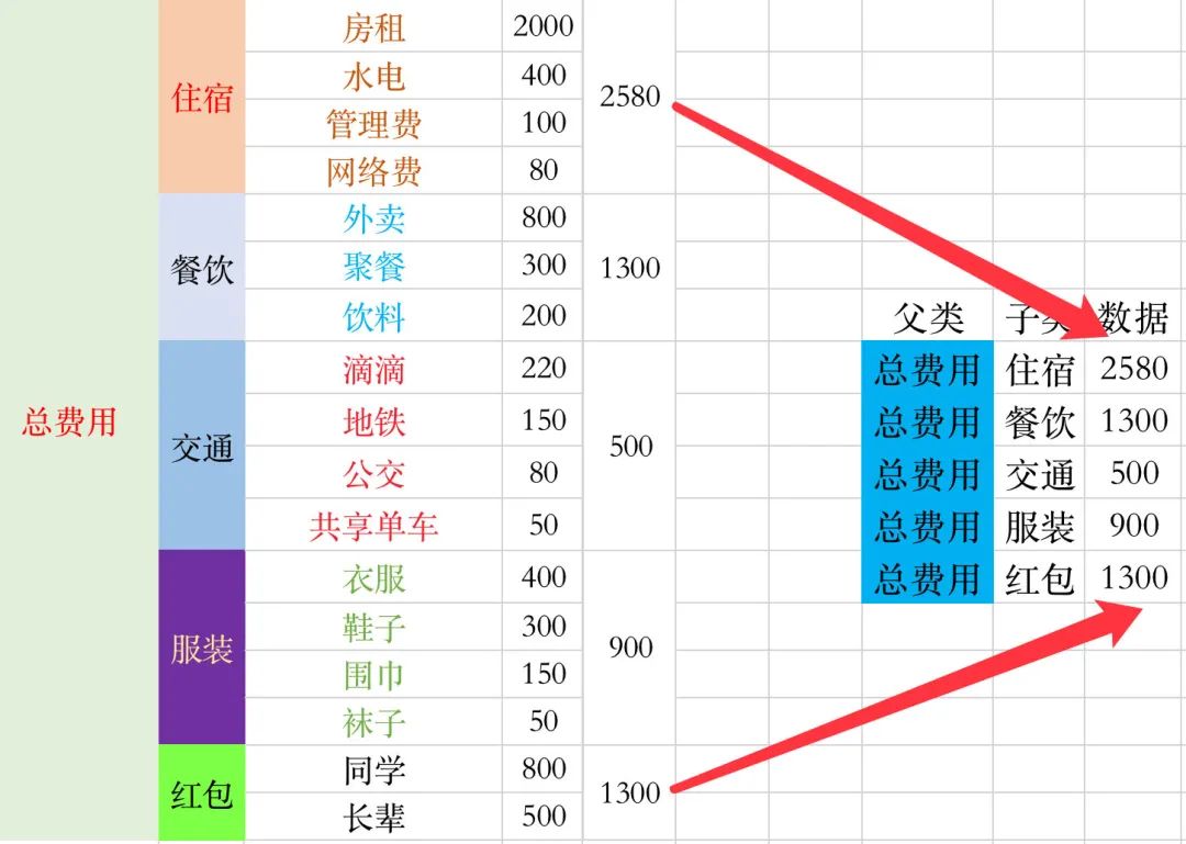 {'source': '总费用', 'target': '餐饮', 'value': 1300},