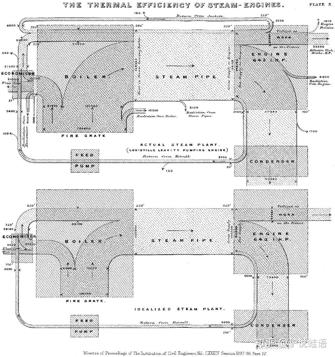 早在 1898 年的时候,他就使用这种图形来表示蒸汽机的能源效率: