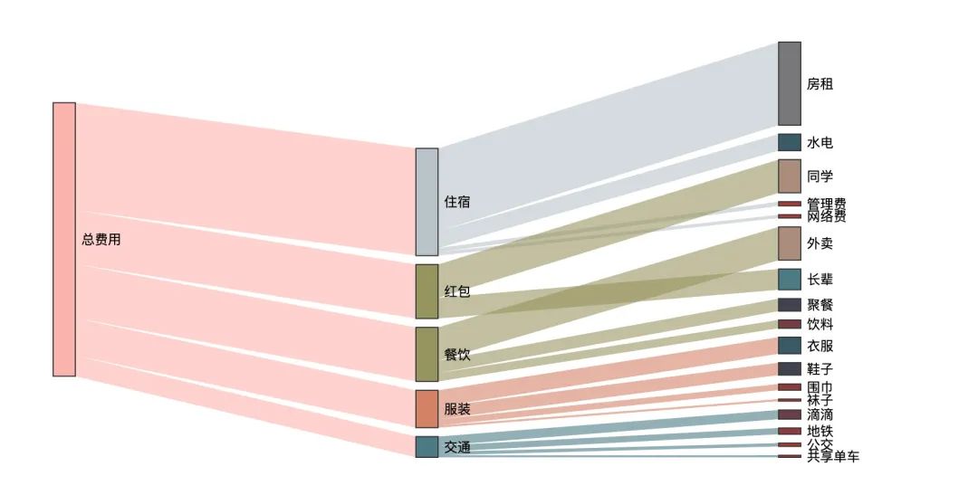 {'source': '总费用', 'target': '交通', 'value': 500},