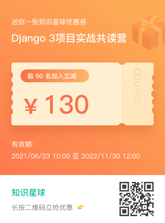 文末再和大家推荐一下我自己组织的英文图书共读营,首期读的就是一本关于 Django 3 的英文原版书。共读营原价199元,公众号读者可以限时优惠 130 元,仅需 69 元即可参与。