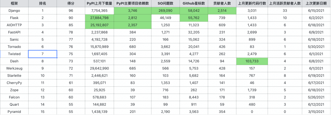 最近有人抓取了 Github、Stack Overflow、PyPI 上的数据,根据开发者在这些平台上的实际使用行为,对目前的 Python Web 框架进行了排名。这个排名不是基于性能来排序的,但整体我认为其实更综合一些,是大家“用脚投票”选出来的。