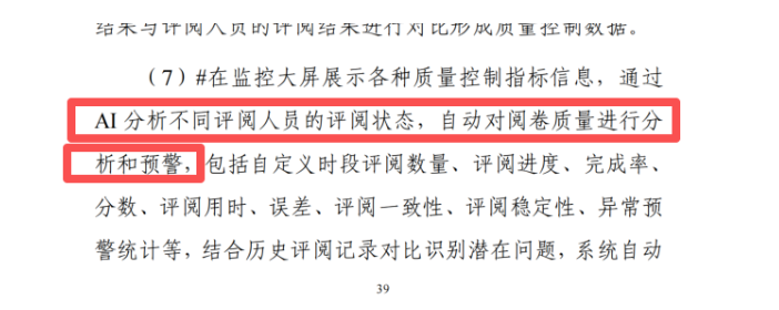采购文件在技术需求部分明确要求:“系统能够结合AI技术提高评阅效率,具备适应多种题型的AI评阅与质量控制功能”(条款2.1.1)。这一定位表明,AI并非取代人工,而是作为核心辅助工具与质量控制单元,深度嵌入阅卷全流程。其核心价值在于,通过机器智能的稳定性与可量化特性,有效弥补人工阅卷中因主观判断差异、疲劳因素及规模化管理难度所带来的潜在不一致性问题,为考试公平提供坚实的技术保障。
