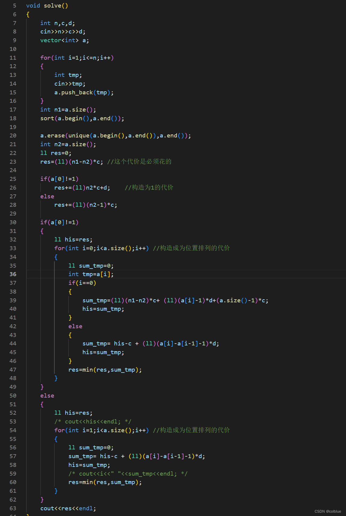 将数组构造成长度为a[i]所需的代价,为构造成a[i-1]所需的代价+ 补上中间缺少的数的代价 + ( -d , (构造成a[i-1]的代价比构造成a[i]的代价多删除了 一个数a[i] ) )