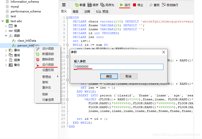 创建2个表,class表插入2000条数据,person表插入10000000(一千万)条数据。插入数据用mysql的函数。person表中通过classid进行关联。然后写出带左连接的语句进行测试。