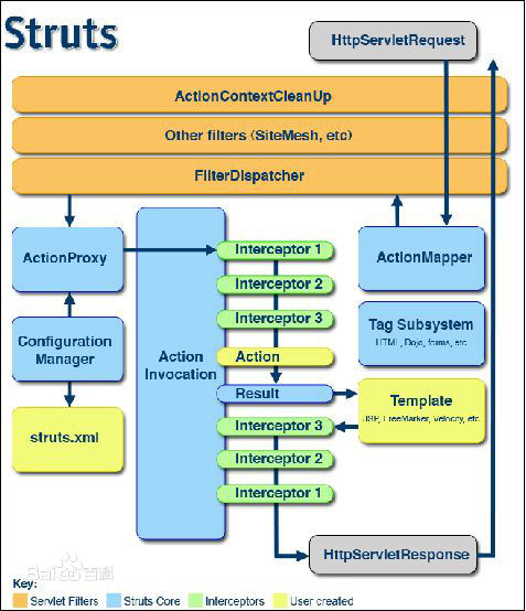 - 最后产生一个 HttpServletResponse 的响应行为,通过 StrutsPrepareAndExecuteFilter 反馈给客户端。