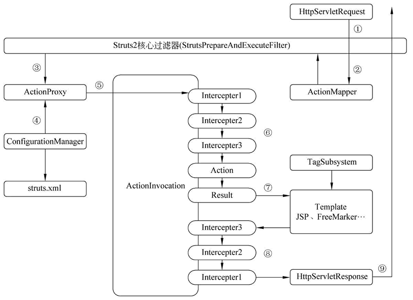 - ActionProxy 通过配置管理器(Configuration Manager)从配置文件(struts.xml)中读取框架的配置信息,从而找到需要调用的 Action 类。