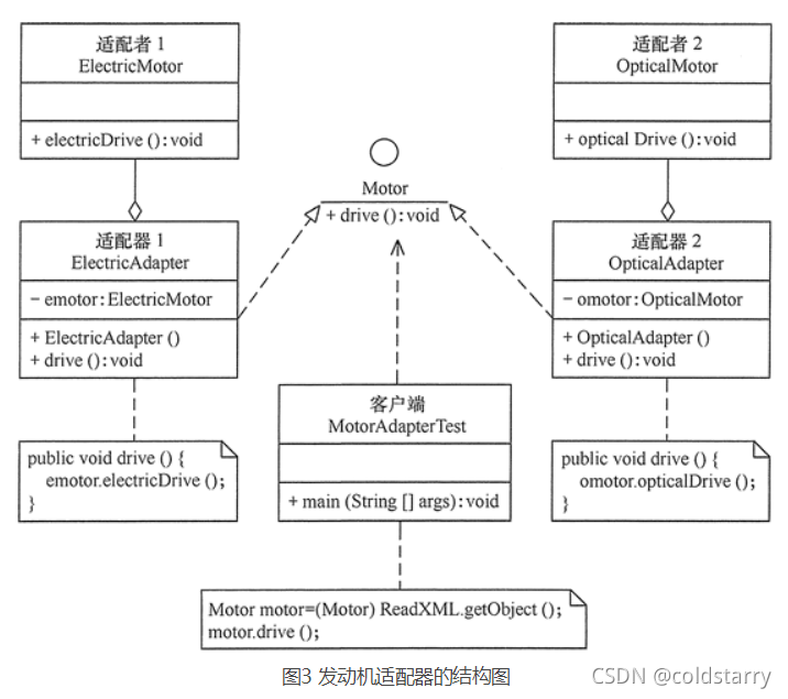 我们把客户端想访问的新能源发动机的适配器的名称放在 XML 配置文件中,客户端可以通过对象生成器类 ReadXML 去读取。这样,客户端就可以通过 Motor 接口随便使用任意一种新能源发动机去驱动汽车,图 3 所示是其结构图。