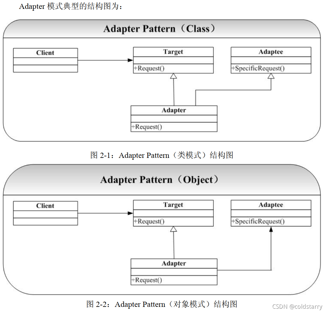 类适配器类/对象适配器类任选其一,对象适配器使用场景更多。类模式的 Adapter 采用继承的方式复用 Adaptee的接口,而在对象模式的 Adapter 中我们则采用组合的方式实现 Adaptee 的复用