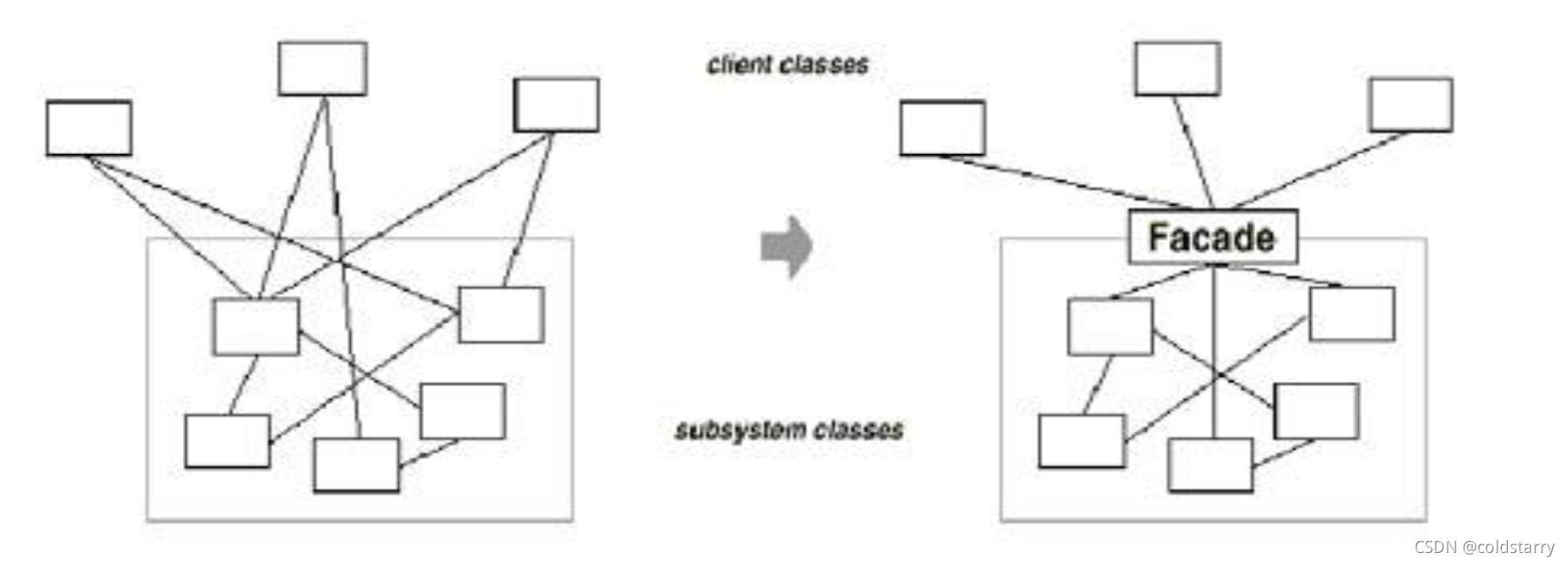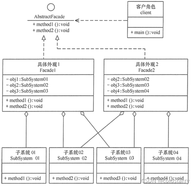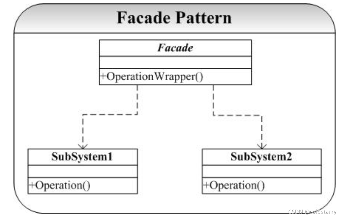 // 外观(Facade)模式又叫作门面模式,是一种通过为多个复杂的子系统提供一个一致的接口,